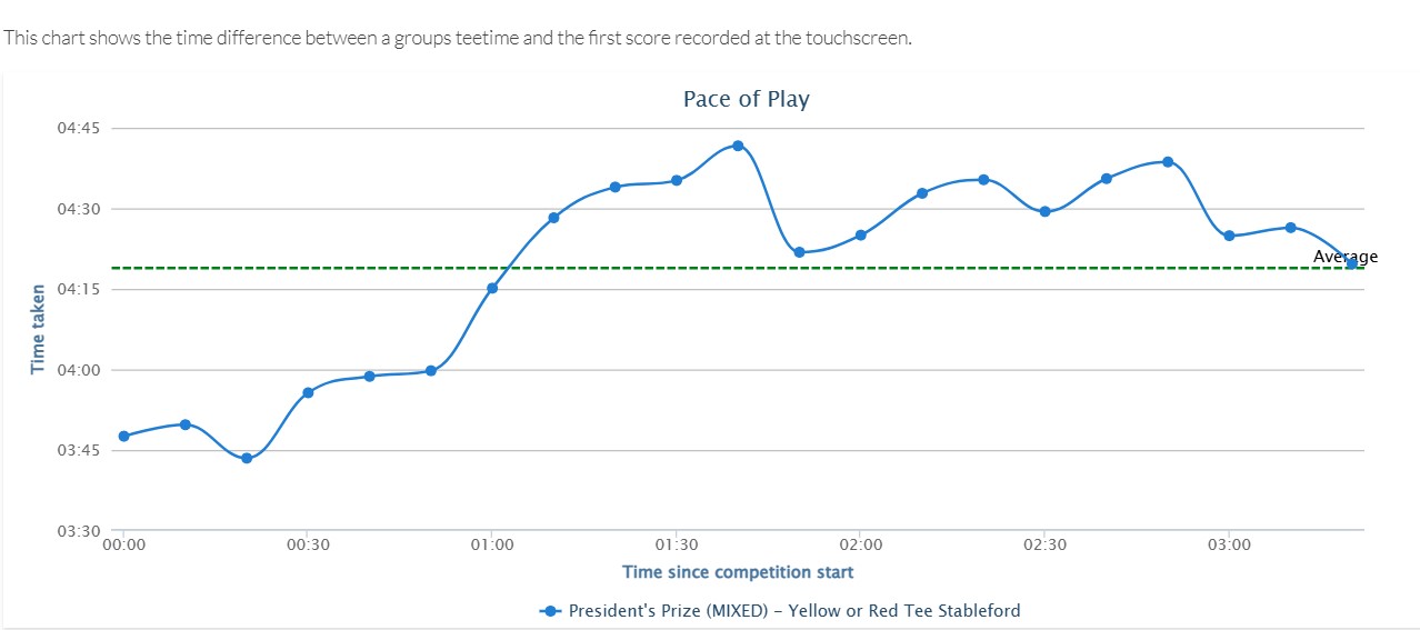 Pace of playWe've had lots of complaints regarding pace of play in competitions lately, (both men and ladies) and this is a problem we've been struggling to get a handle on. We've tried increasing tee time intervals, putting buffers in the middle of the field, using a starter to make sure groups tee off at the right time, to no avail. The pace of play graph below offers a telling story of how a golf competition can begin briskly and gradually descend into a bit of a trudge. The blue line charts how long each group takes from their tee time to recording their first score on the touchscreen. The dotted green line represents the average time (just over 4 hours and 15 minutes), which several groups later in the competition exceed. In the opening half-hour or so, players are moving swiftly — times hover below 4 hours, dipping close to 3 hours 45 minutes. As time goes on (moving left to right), we see a general upward trend in the time taken — meaning pace of play is slowing down. The early groups set a good pace, but as the morning rolls on, the field slows up. By the halfway point of the competition, things have bogged down a bit. It's that classic "domino effect" — one slow group causes a queue, and from there it's impossible to recover. We can see from this which groups start to slow down play and while we don't want to name and shame repeat offenders, we may need to take action if this carries on. This is a good illustration of the effect slow groups have on an entire field. Once a group slows down, the entire field slows down. To help alleviate this, please try and follow these simple rules: