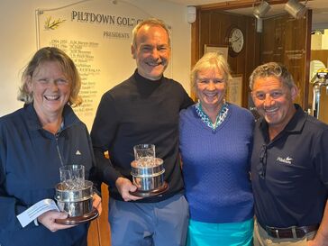 The weather was just perfect for this annual event which marks the start of the year for the respective captains. I’m delighted that the Junior Captain is brilliant golfer Evie Lewis and I can only see her handicap going down during the year. Tsol Keoshgerian is the Men’s Captain, so lots of fun should be had by all. Preceding this was the Millennium Trophy Mixed Foursomes, this year won by Sue Adams and Mark Wallwork, (39 points) beating Rosemary Burns and Simon Dougall on countback.